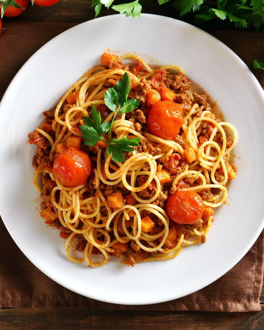 Ajouter la sauce bolognaise et 1 à 2 cuillères de l’eau de cuisson des pâtes aux oignons et laisser revenir quelques instants.