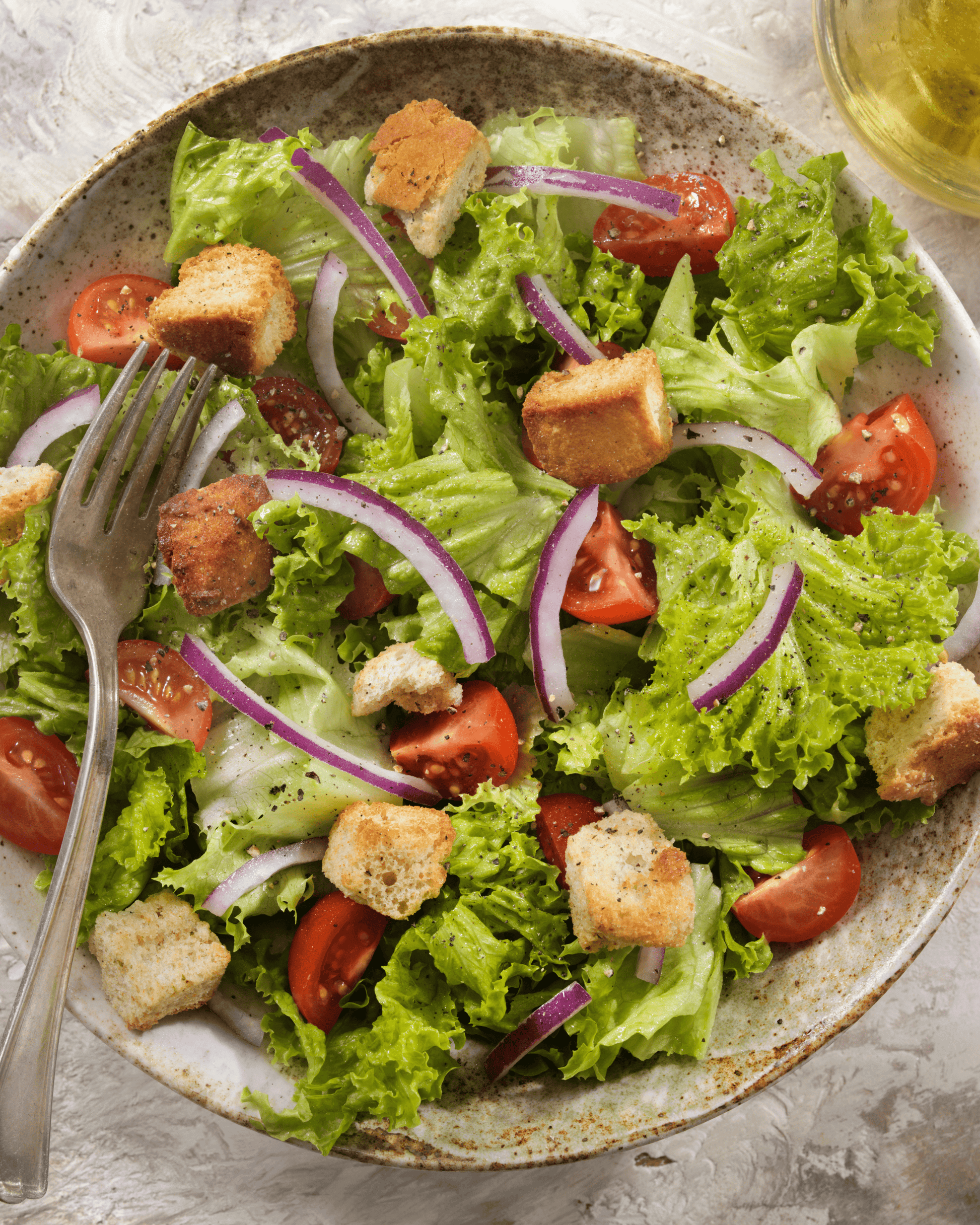 - Ajouter les croutons de pains dans le saladier. Et assaisonner la salade à votre guise: huile d’olive, balsamique, citron, sel, poivre.