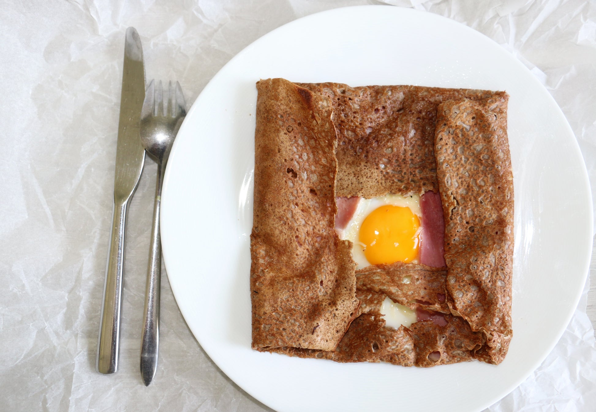 - Ajouter le jambon et le jaune d’œuf s’il a été mis de coté. Plier la galette en 4, ajouter un morceau de beurre sur le dessus de la galette.
